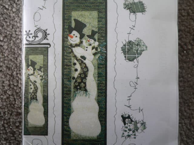 This kit is a lovely tablerunner or wall hanger 6in x 22in. The colours have been changed to a more funky snowman with reds yellow/green and turquoise